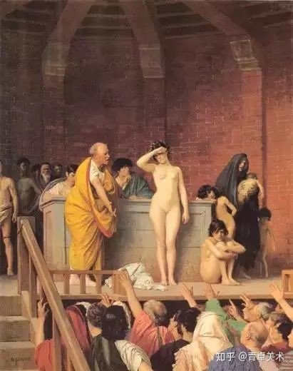 近东地区司空见惯的奴隶拍卖,引起了画家的注意。被剥去衣衫的女奴,裸体站在台上被拍卖,台下是争相竞价的商人,他们伸出手指,暗喻买奴隶的价格,女奴们茫然地望着这一切,听凭命运的摆布……